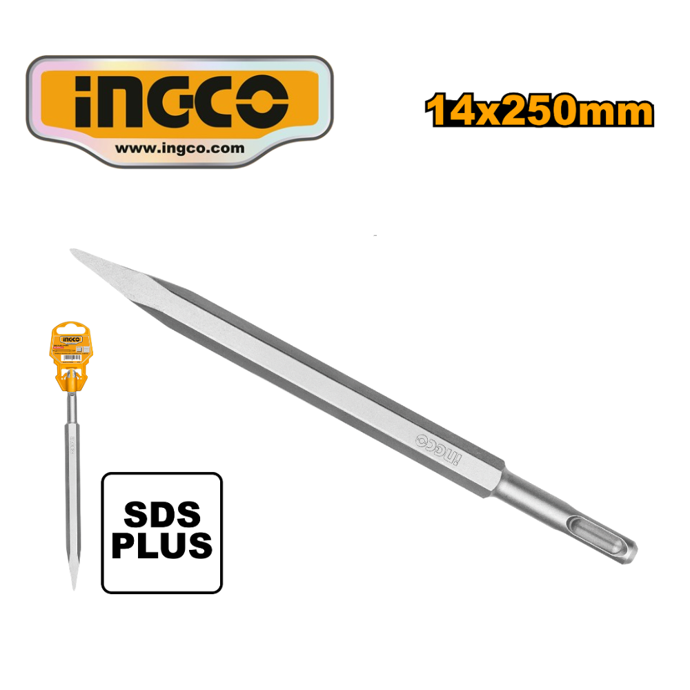 Cincel SDS Plus punta aguda 14 × 250 mm de alta resistencia, ideal para demolición precisa y trabajos exigentes en concreto y mampostería. Rendimiento profesional.