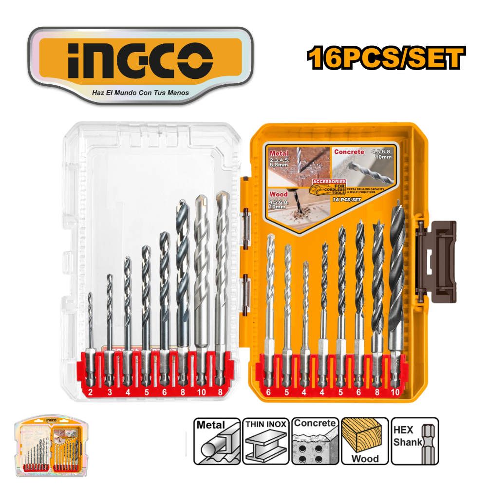 JUEGO DE 16 BROCAS PARA METAL/MAMPOSTERÍA/MADERA – #AKDL11608