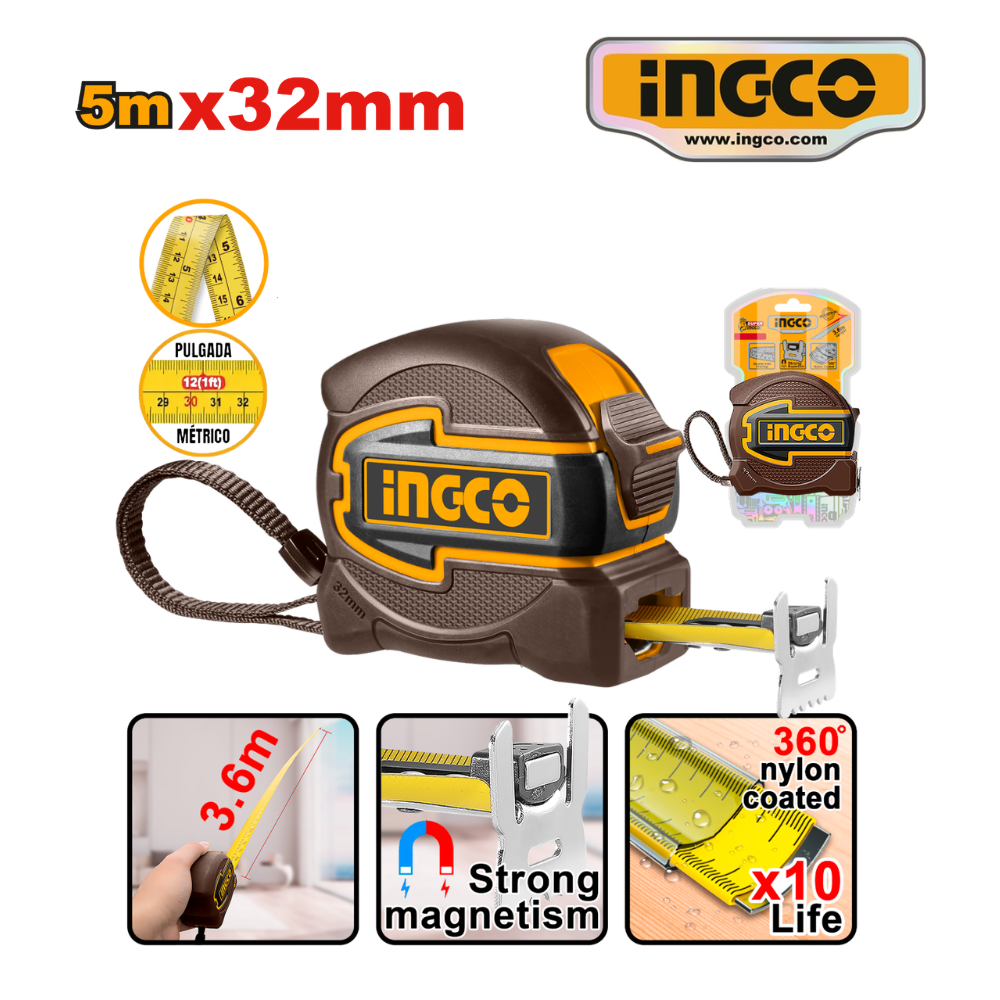 Wincha con recubrimiento de nylon 5 m × 32 mm, doble impresión y punta magnética para mediciones rápidas y precisas. Máxima resistencia y visibilidad.
